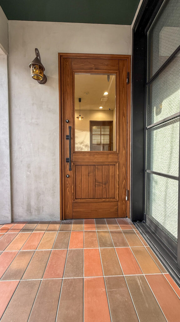 店舗の顔とも言える入口の扉には、こだわりの木製ドアを採用しました。一般的なアルミやスチール製のドアに比べて、やはり本物の木には、圧倒的な高級感と温かみがありますね。