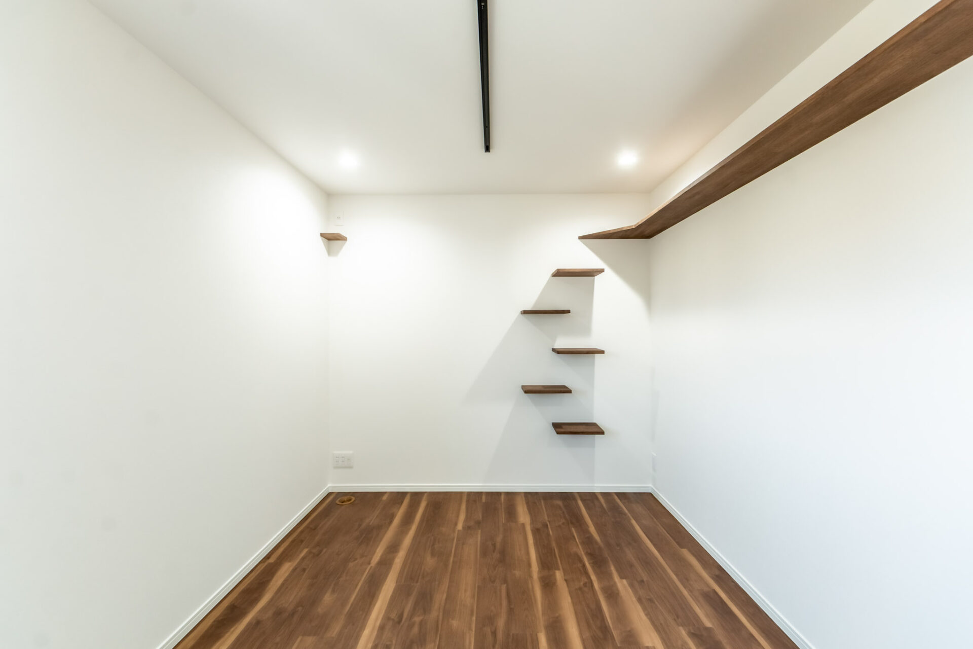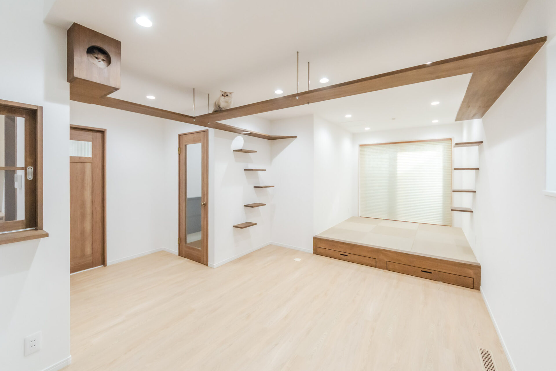こちらのお部屋にはキャットウォークを設置。さらに壁には三角形の猫ちゃんの休憩スペースもつくりました。