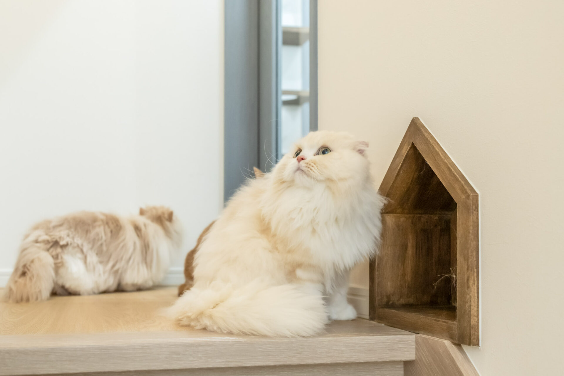 透明ガラス越しには、飼い主さんの帰りを待っていた猫ちゃんたちの姿がすぐに目に入ります。