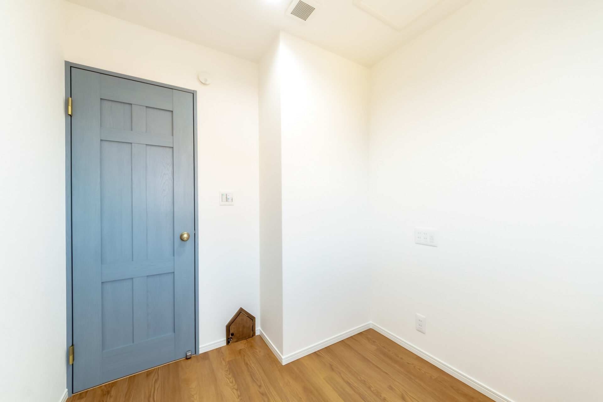 こちらの部屋にも猫扉があり、オンラインミーティング時や作業に集中したい時には、猫ちゃんが入らないよう内側から閉めることができます。