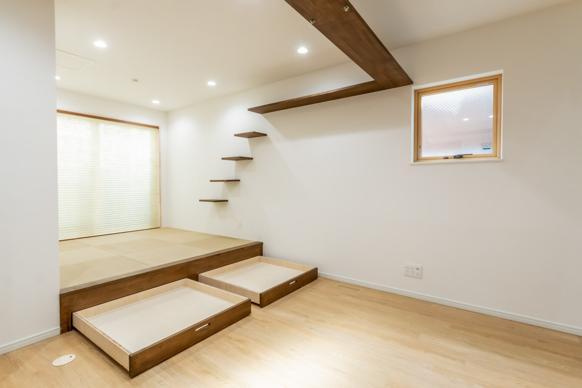 こちらの小上がりには引き出し収納があり、ヨガマットや猫ちゃんのうんち回収袋、ブラシなどを収納される予定です。