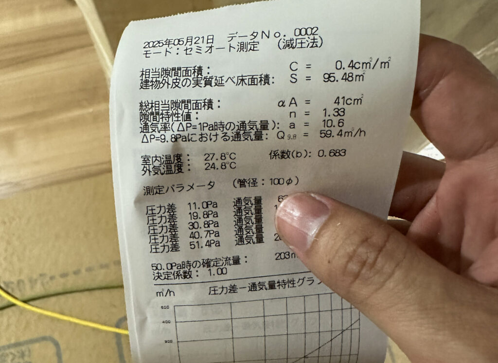 慎重に気密処理をして、丁寧に断熱材を入れ、防湿シートを張り、いよいよ気密測定です。
