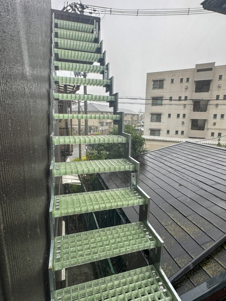 外階段は鉄骨で製作し、レッカーで吊り、建物の奥まで運びました。