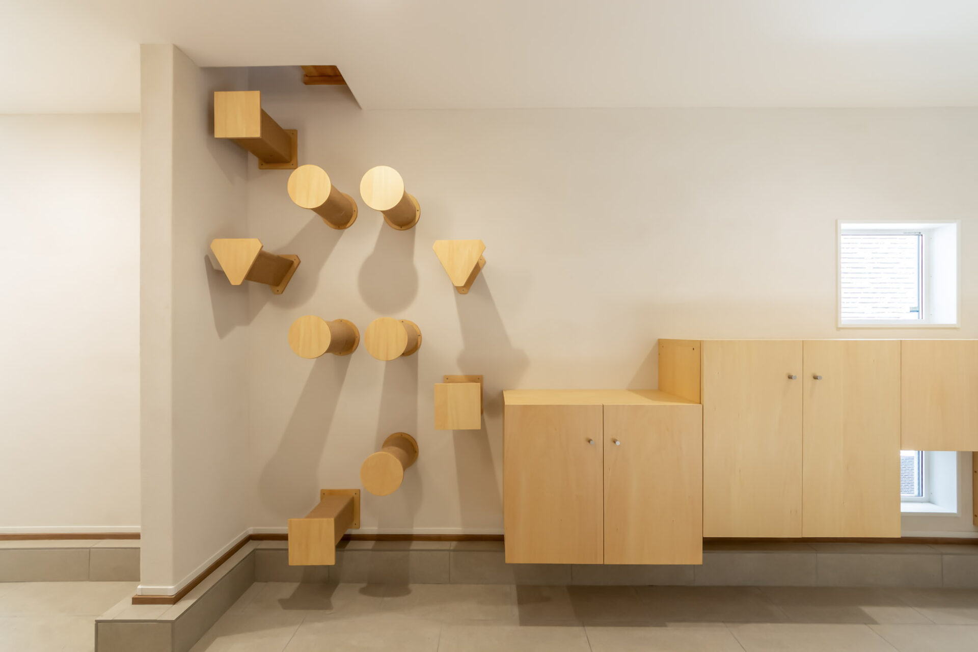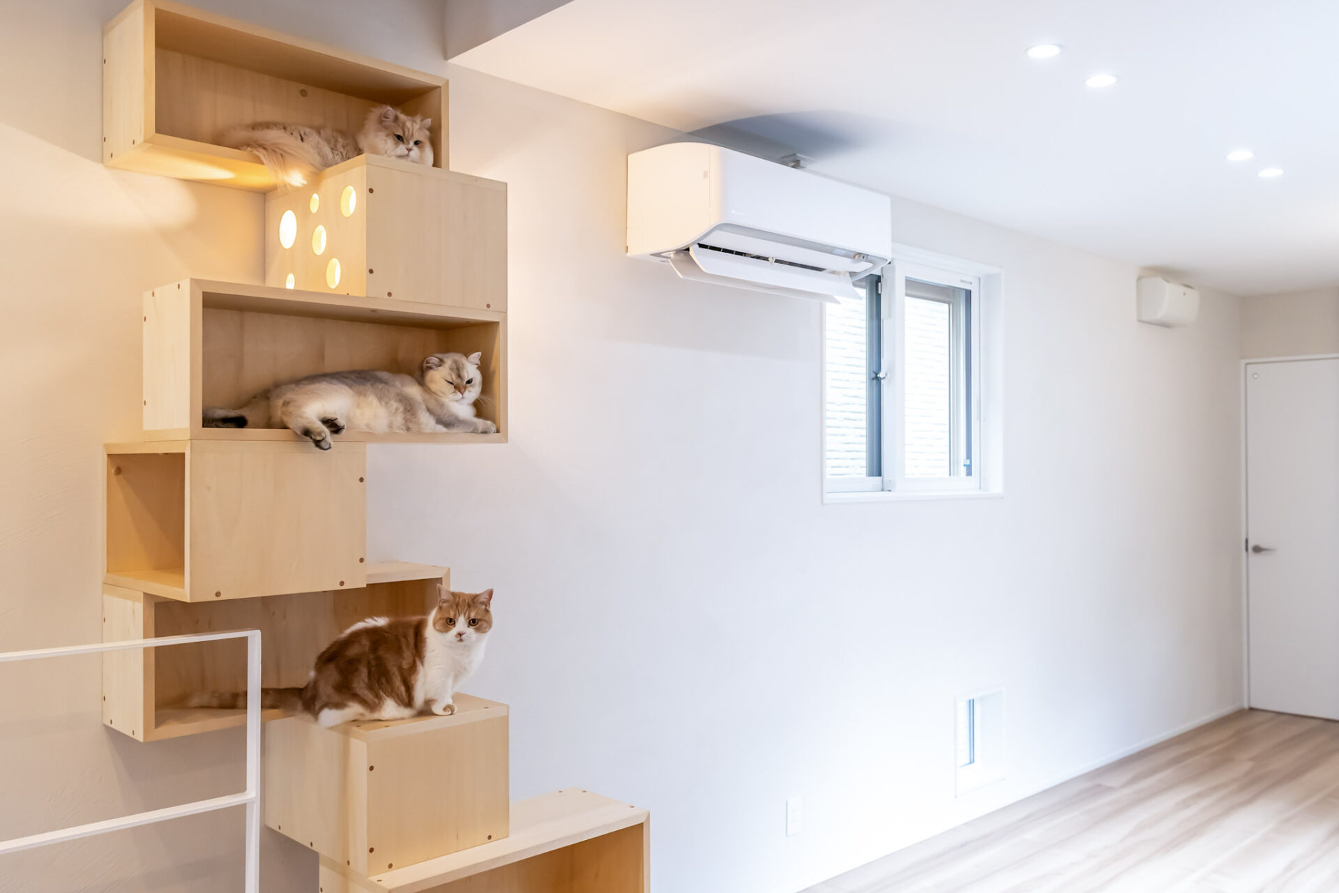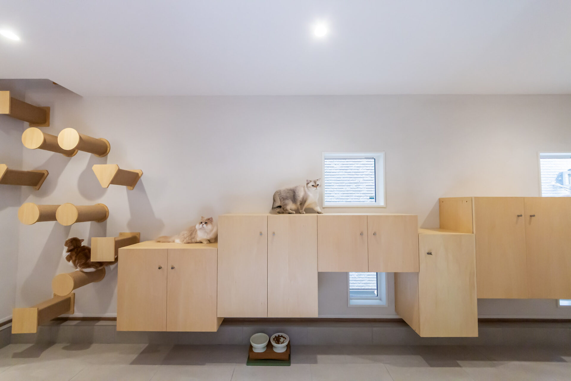 高さをあえて変えて設置することで、収納でありながら猫の遊び場としても機能します。