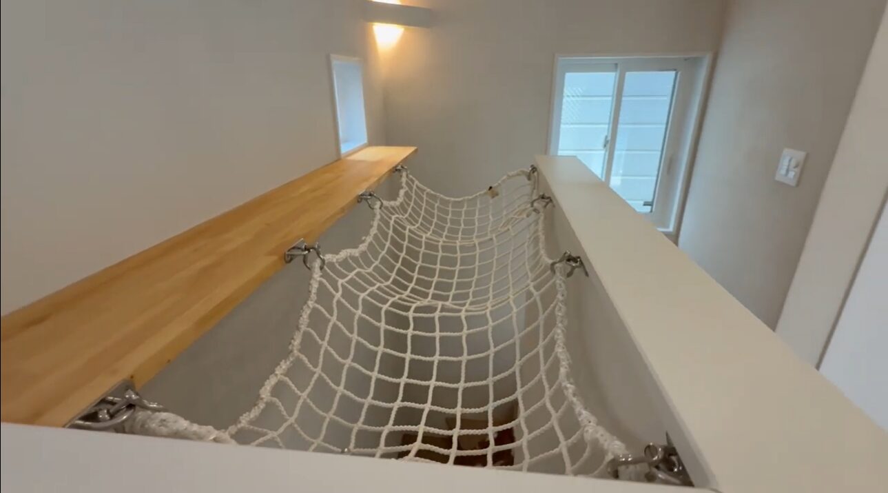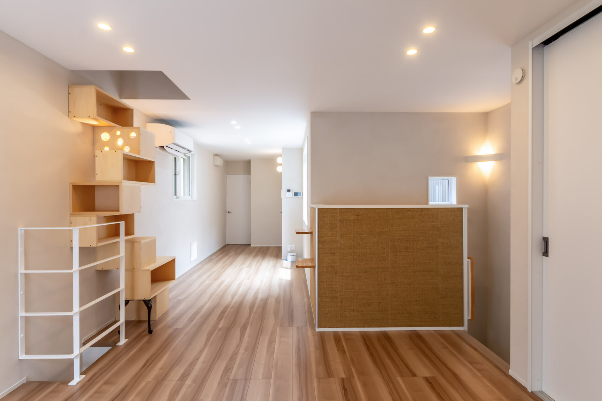 猫がスムーズに移動できる動線を意識しつつ、人の安全にも配慮して手すりを設置しました。人と猫、どちらにとっても安心な設計です。