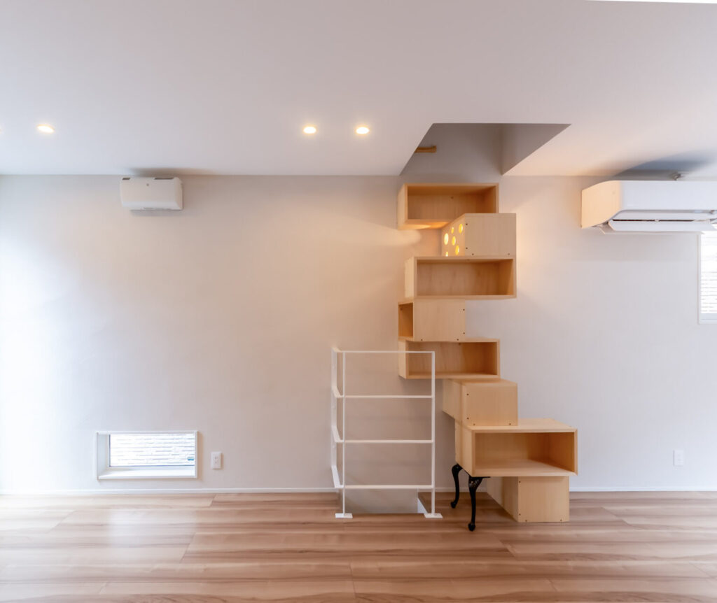 吊戸棚ウォークの先には、糸車型の造作ステップ。