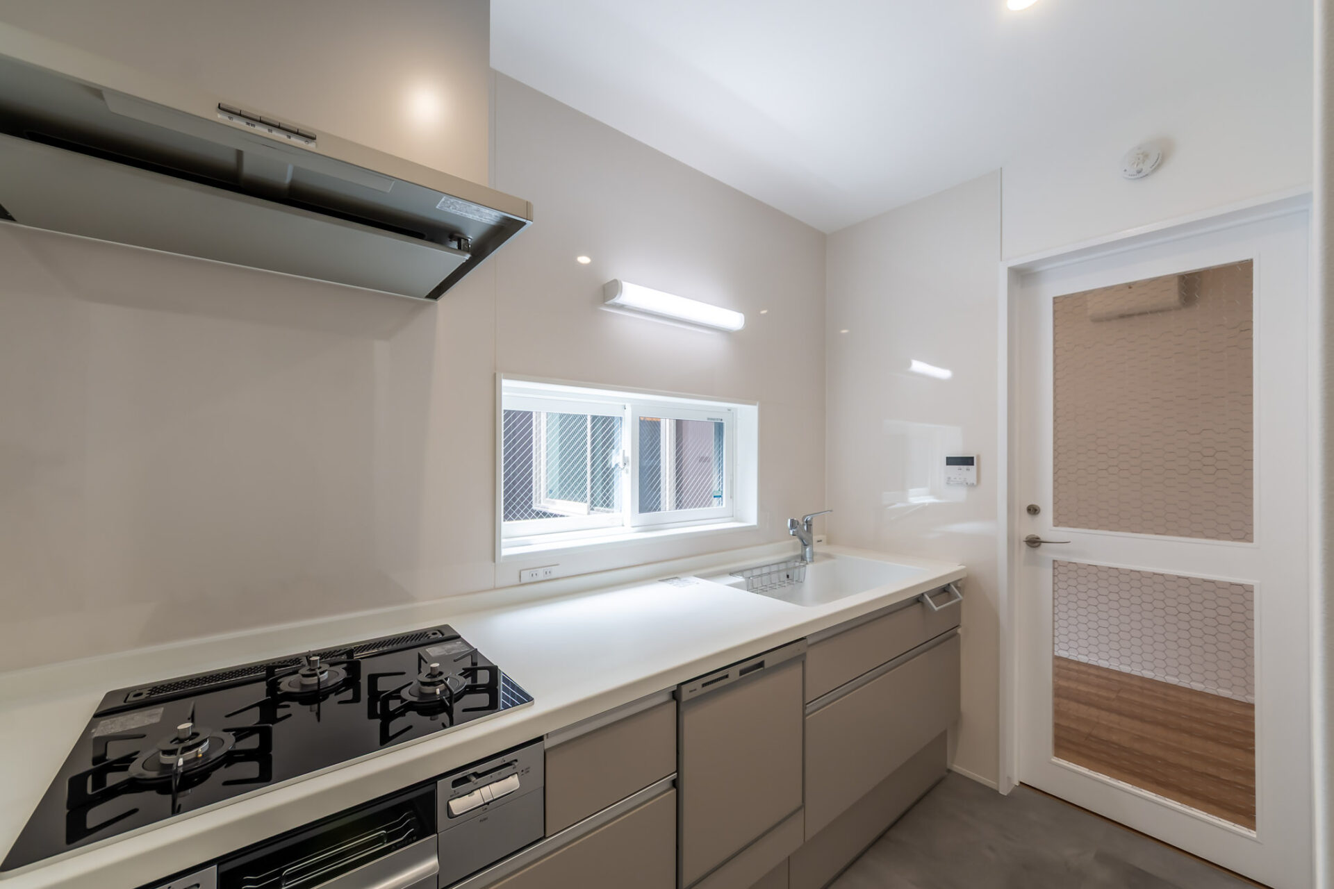 中庭を見渡せる窓を設けることで独立キッチンでありながら、閉塞感を感じさせない開放的な空間に仕上げました。