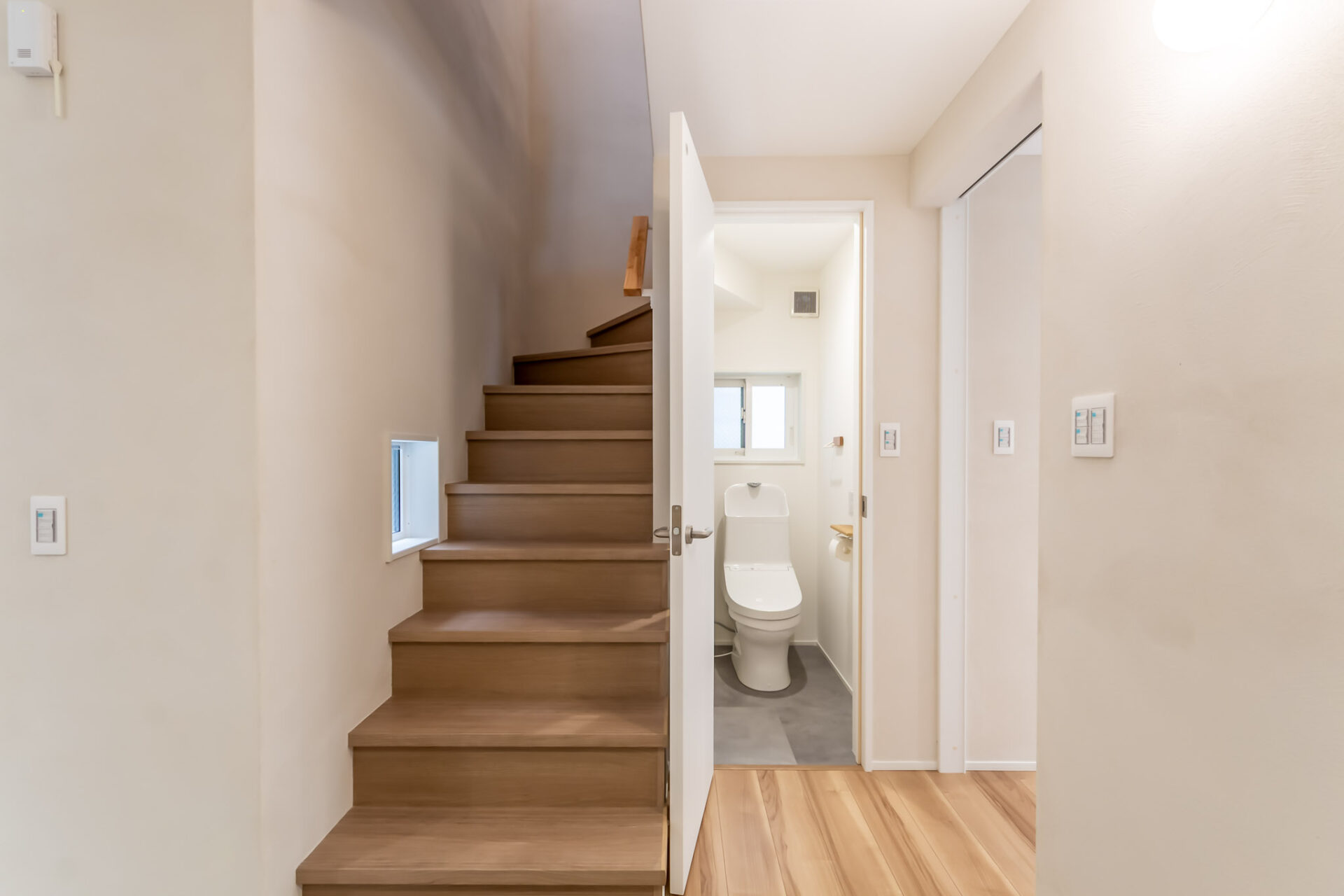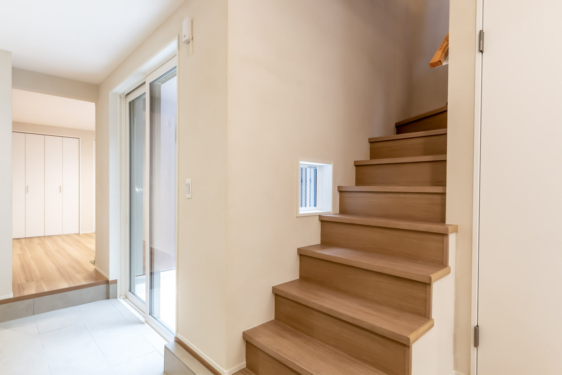 2階へと続く階段の途中には、中庭を覗ける窓を設置。