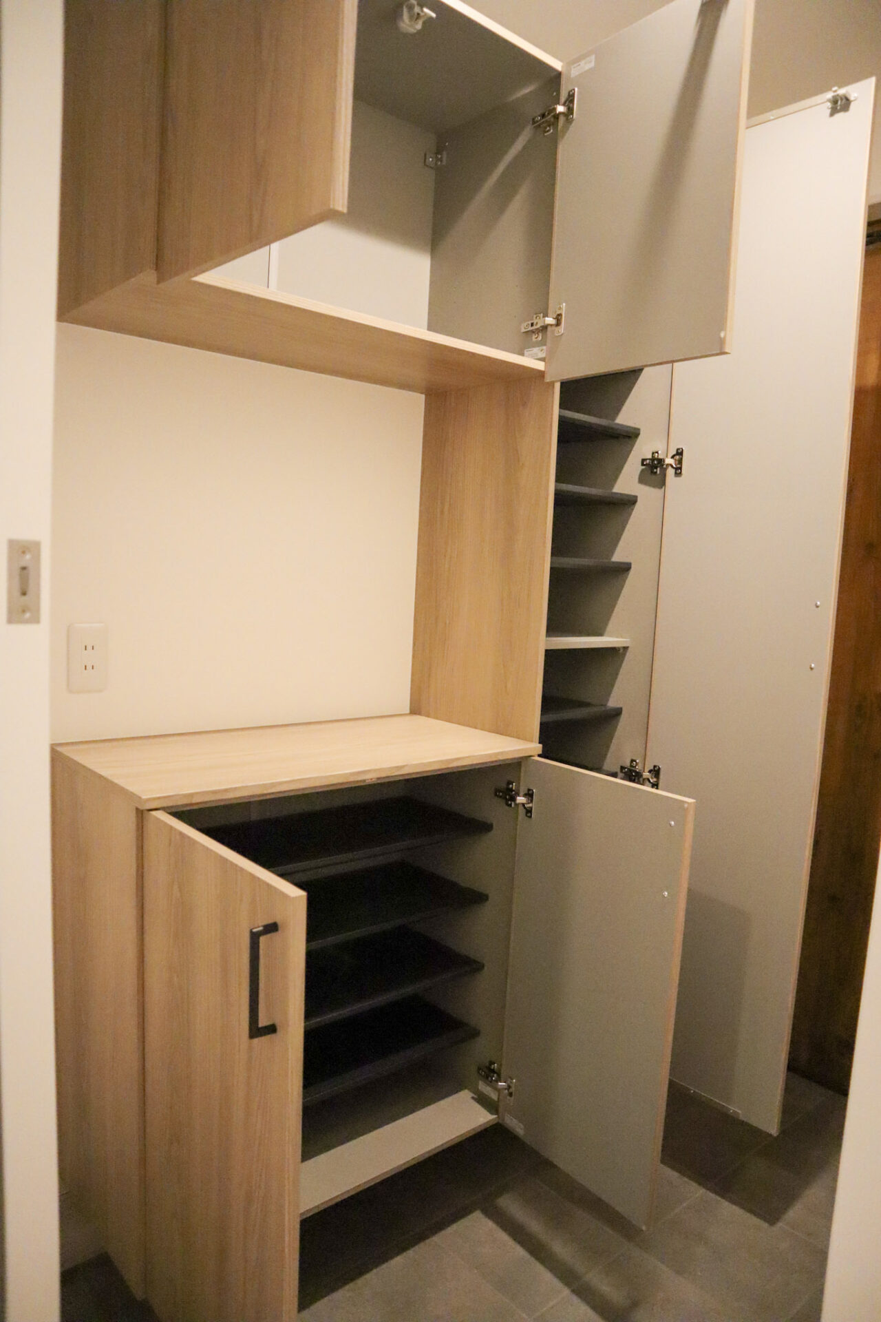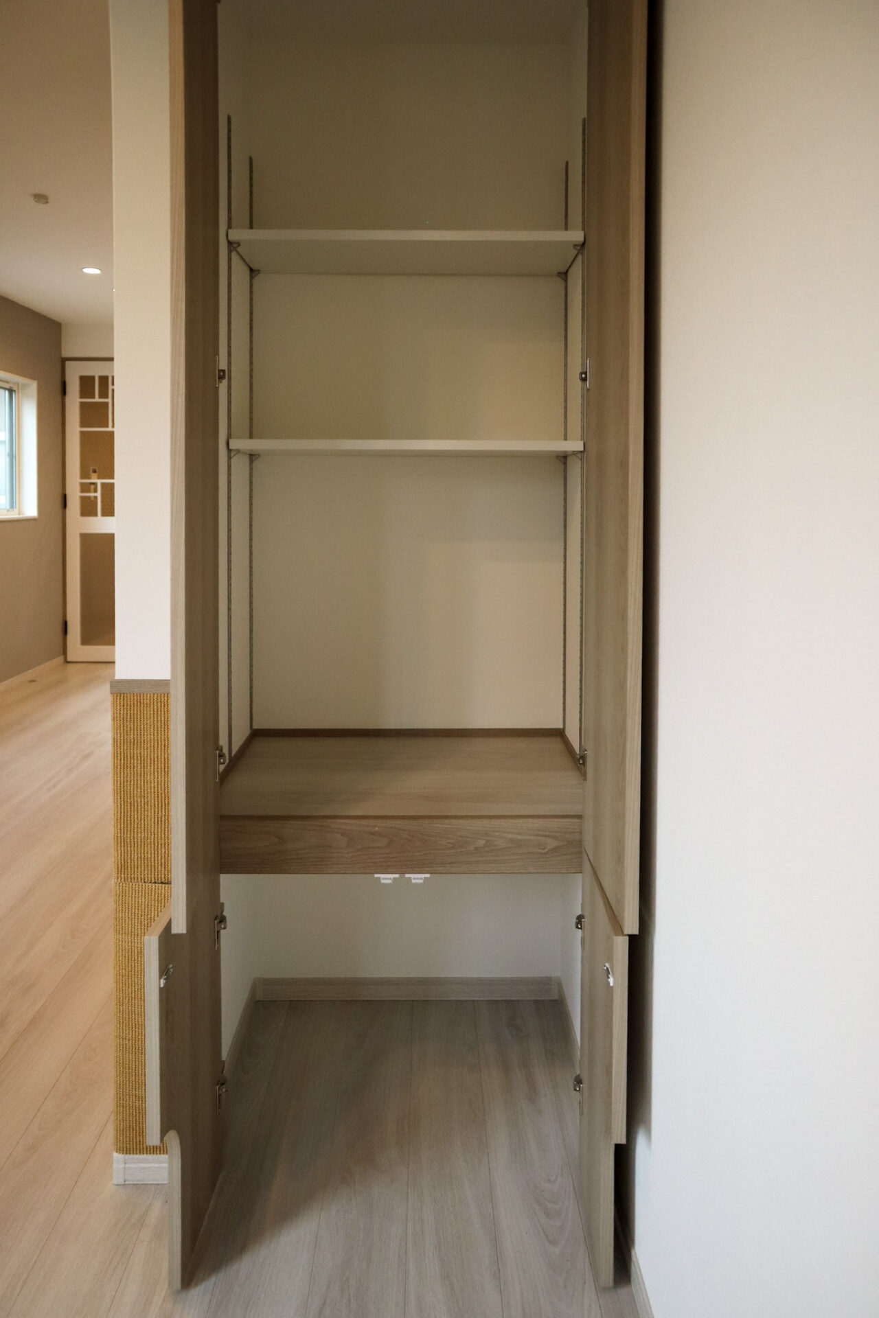 人が使うにはかがむ必要があり、デッドスペースになりがちな下部分は、猫トイレをすっきり収められる専用スペースとして有効活用しました。