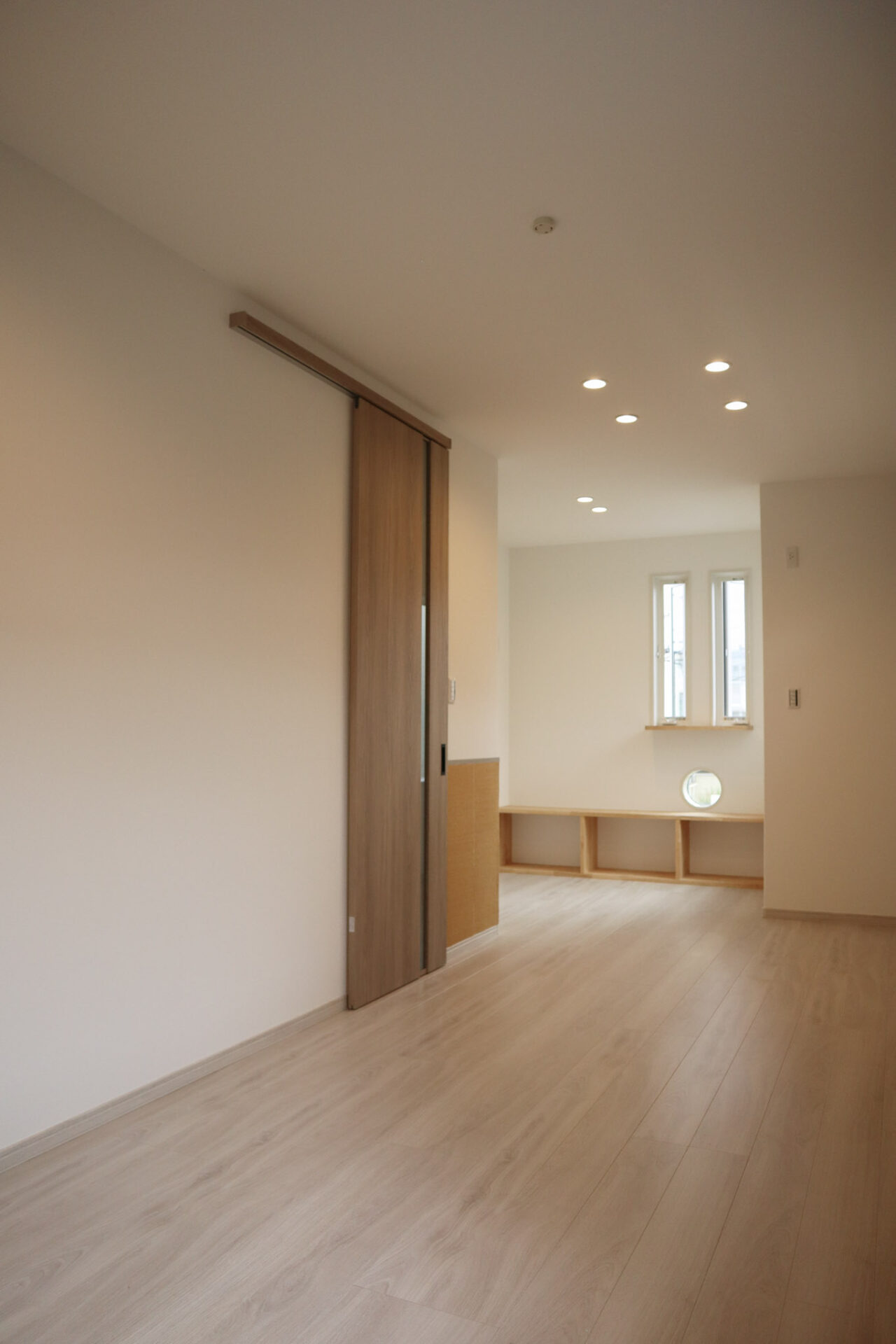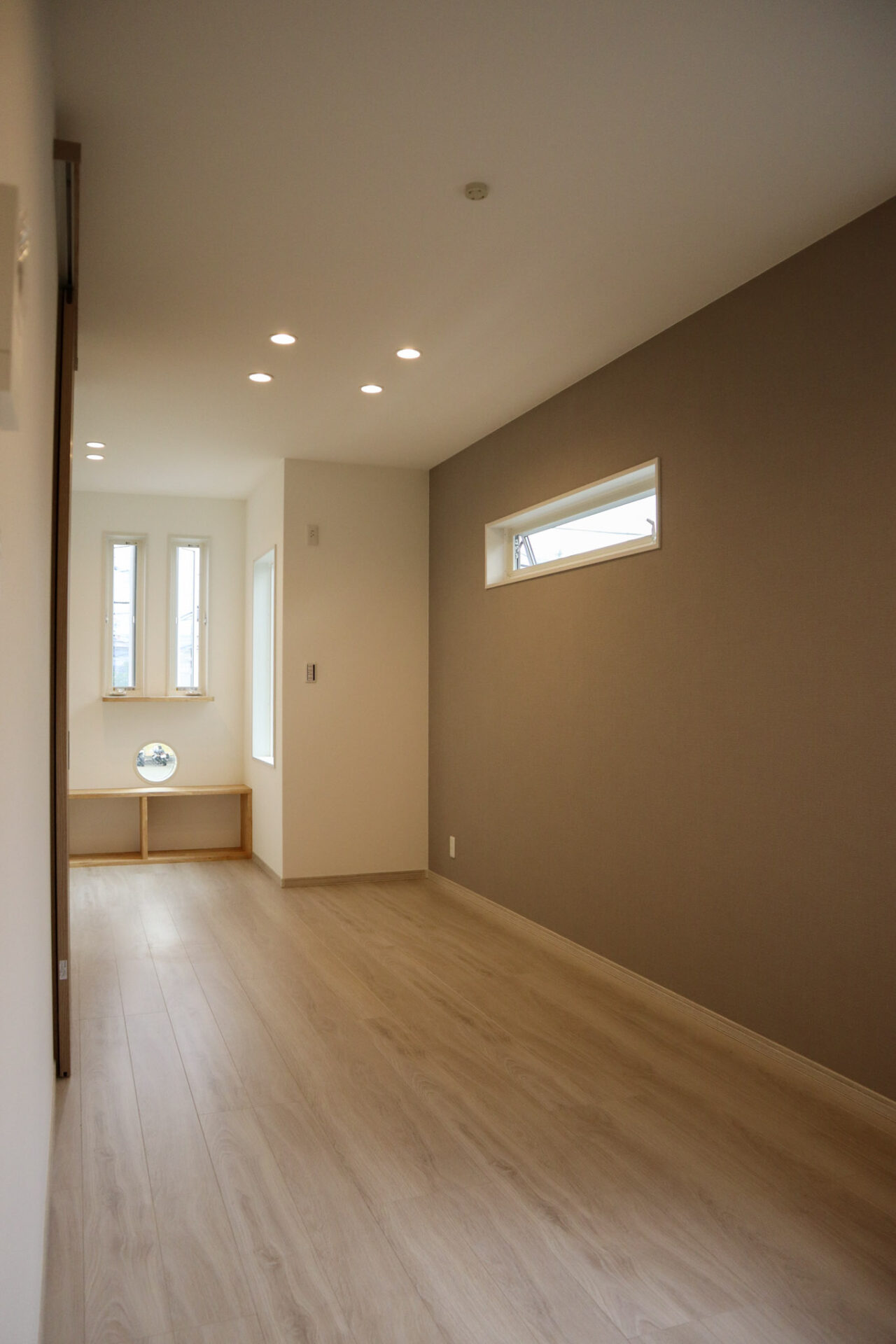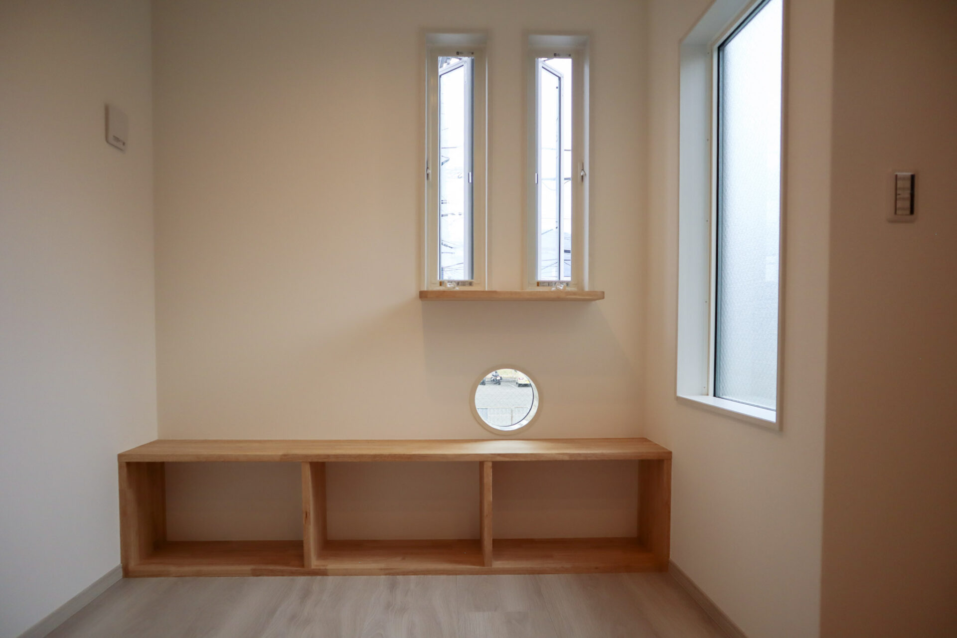 猫ちゃんやワンちゃんが覗いてくれるのが可愛い通称「おかえり窓」を設けました。まあるい窓からひょっこり覗いて帰りを待ってくれたら疲れも吹っ飛んでしまいそう。