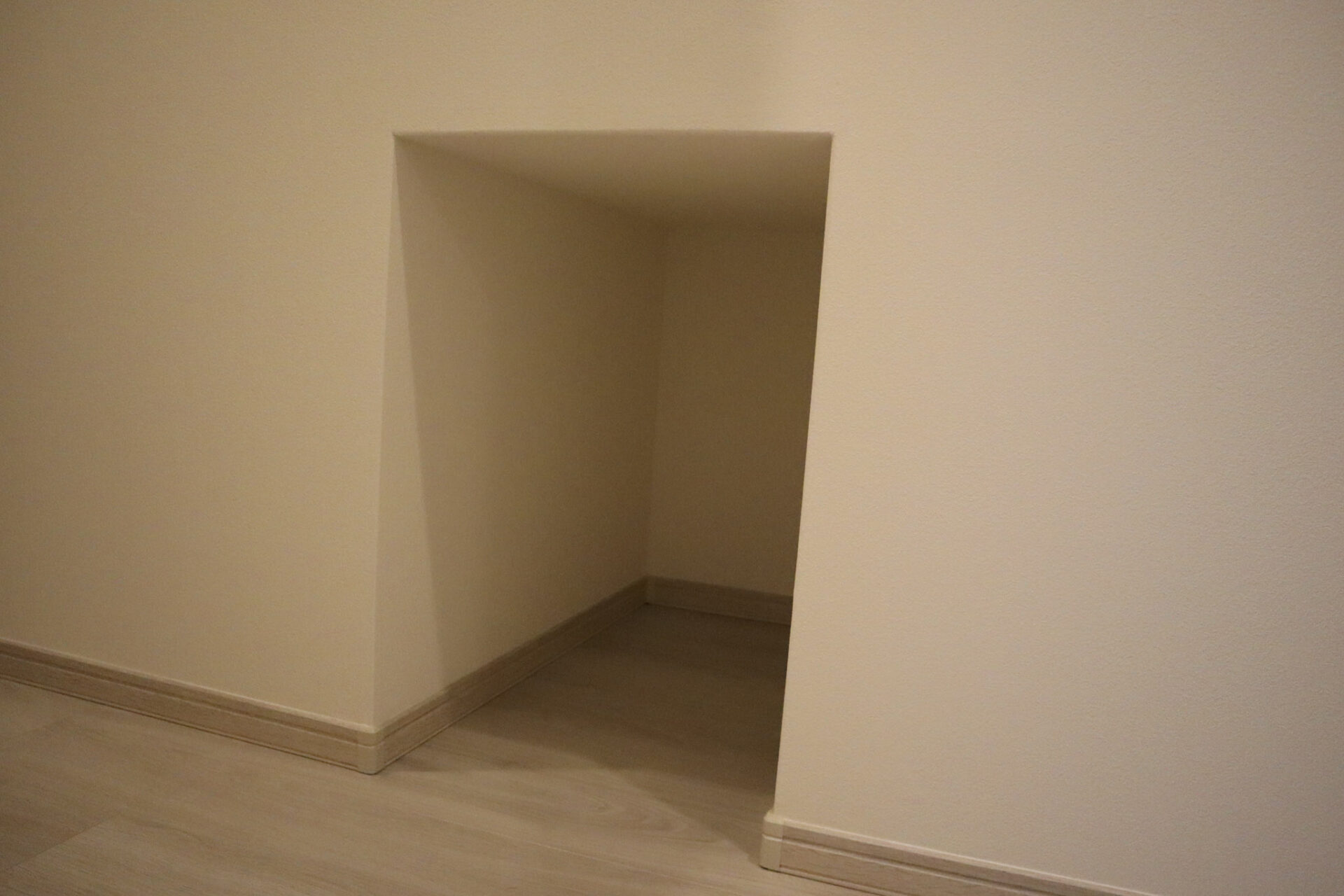 ウォークインクローゼット内の段差の反対側はあえて凹ませることで、猫トイレを置けるスペースとして有効活用。