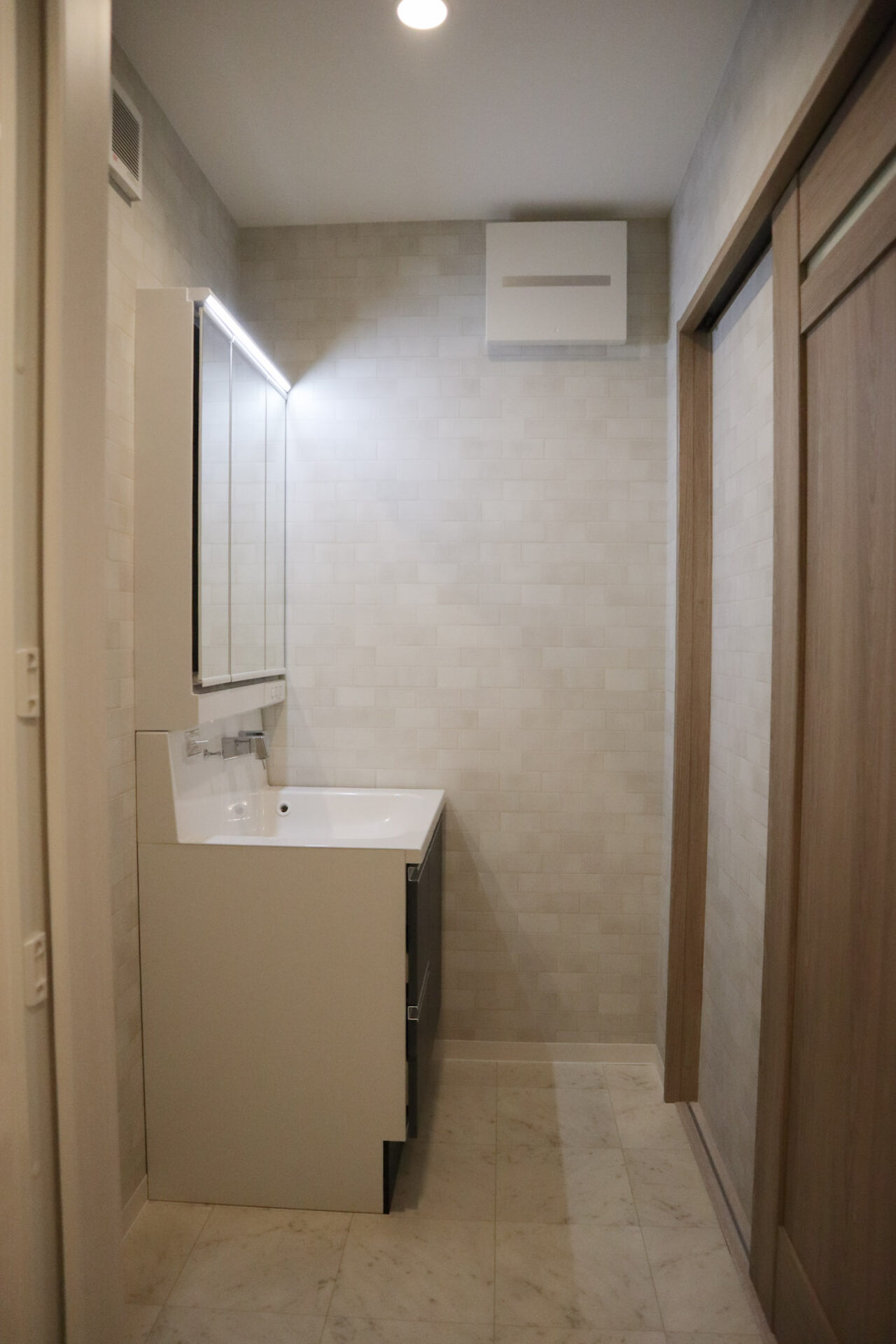 廊下をさらに進むと、白とグレーで統一されたシックなテイストの洗面脱衣室。