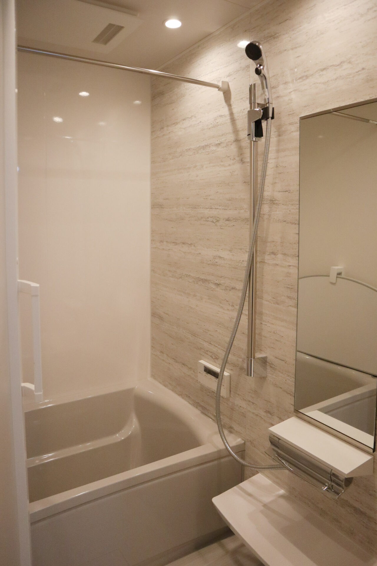 浴室の扉は使いやすい開き戸タイプで、追い焚き機能に加え、浴室暖房も備わっているので、寒い季節でも快適にバスタイムを楽しめます。