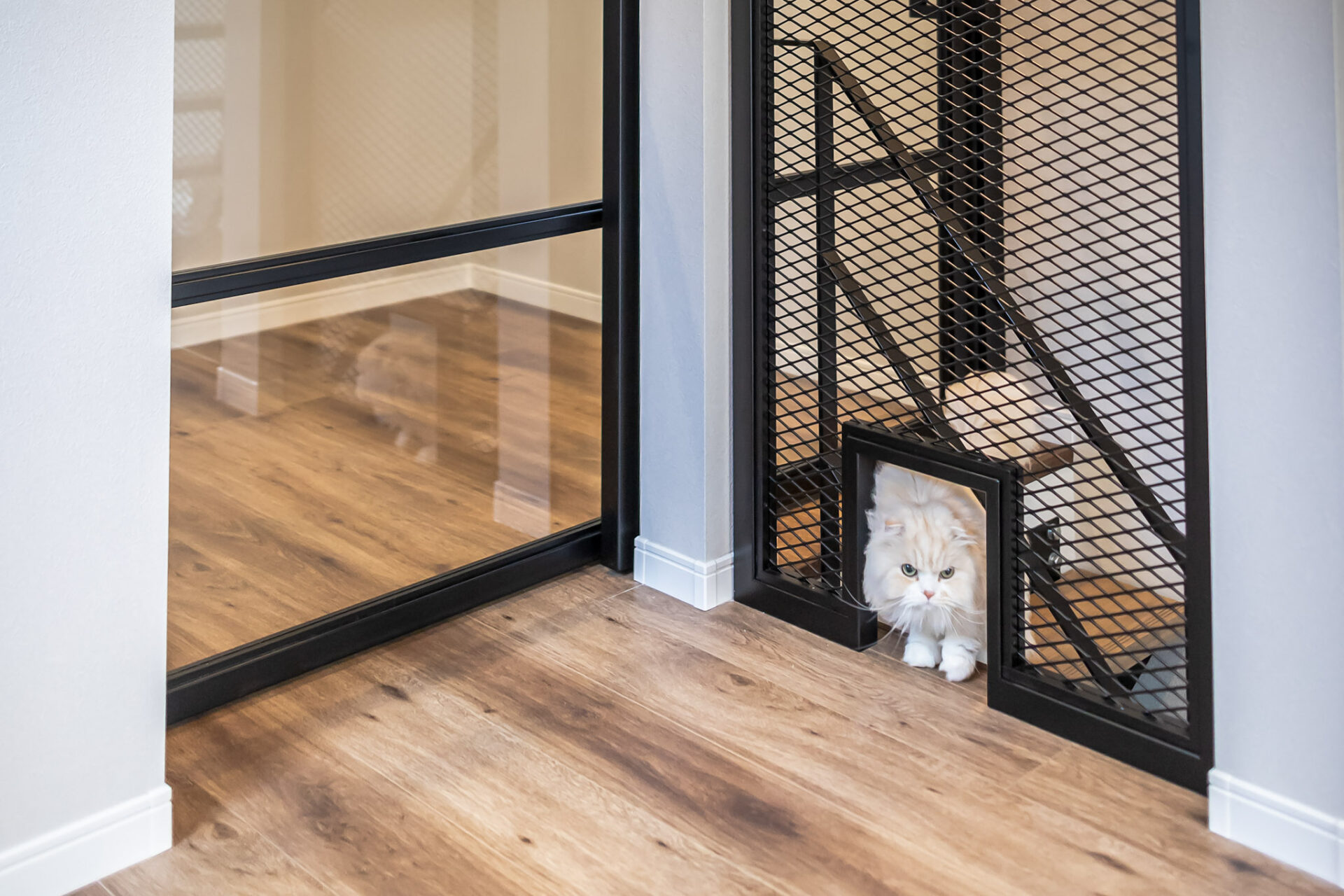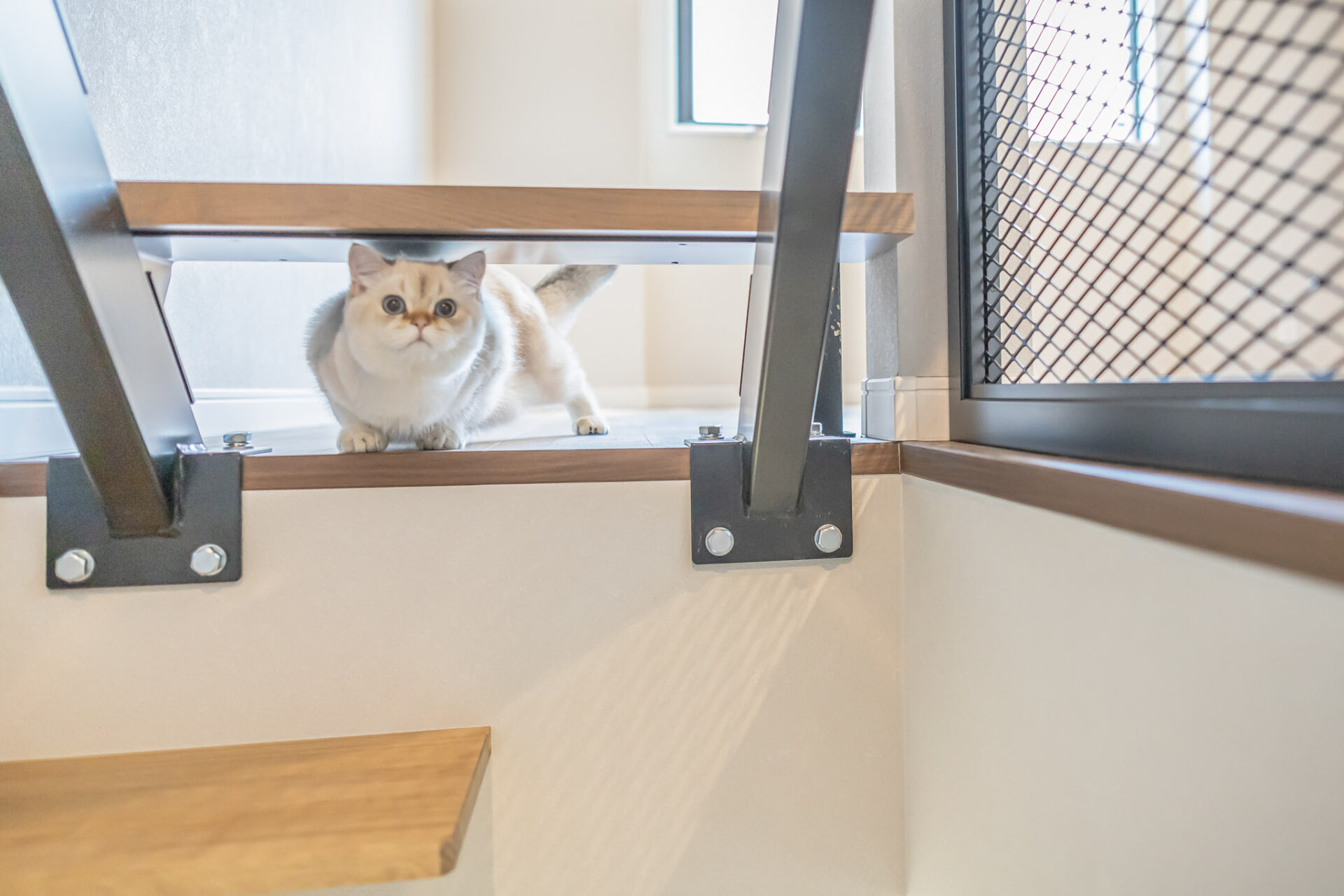 階段を登った先の横のアイアンメッシュ状の壁には猫通路があり、猫ちゃんはキッチンを通らずにこちらからリビングに行くことができます。