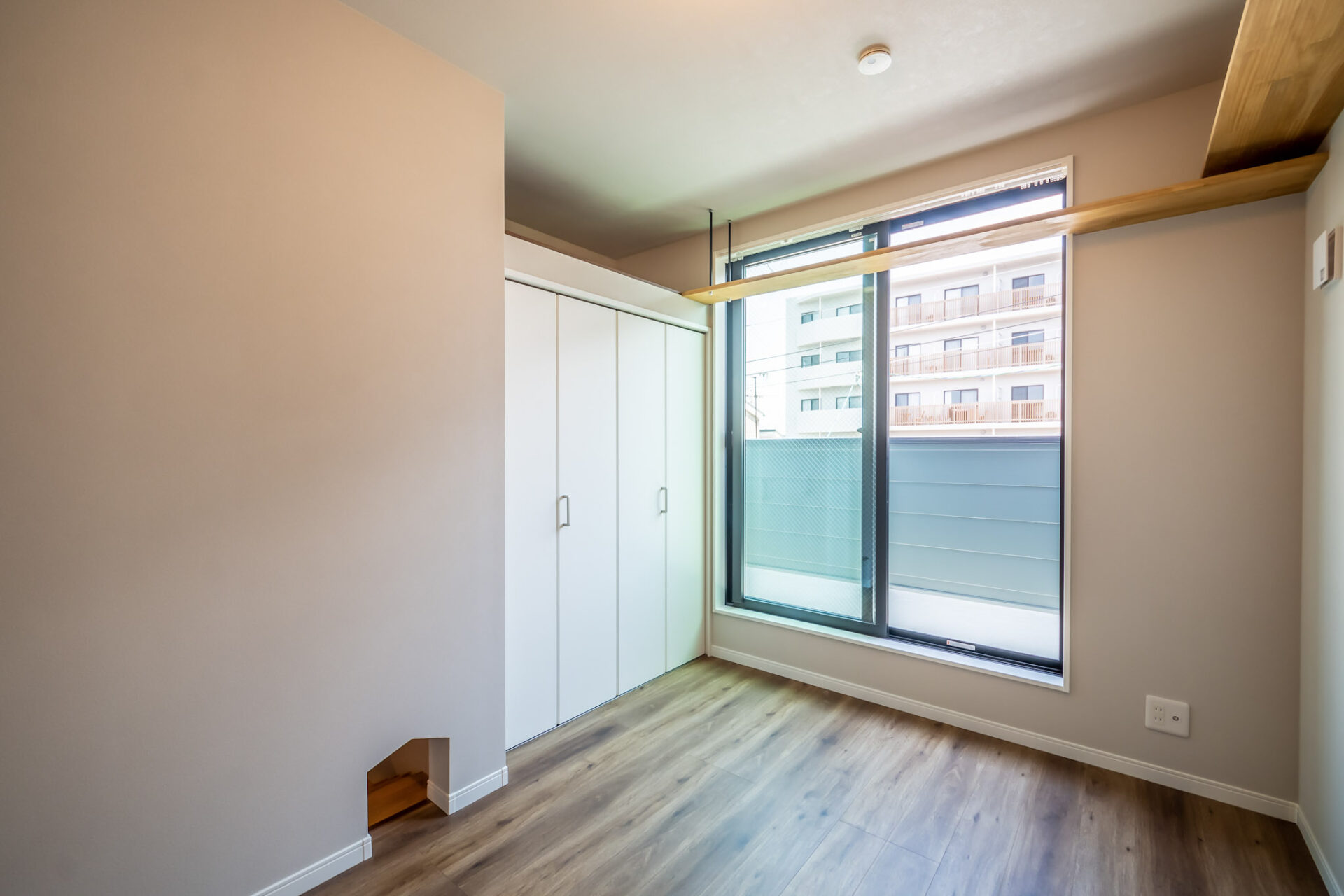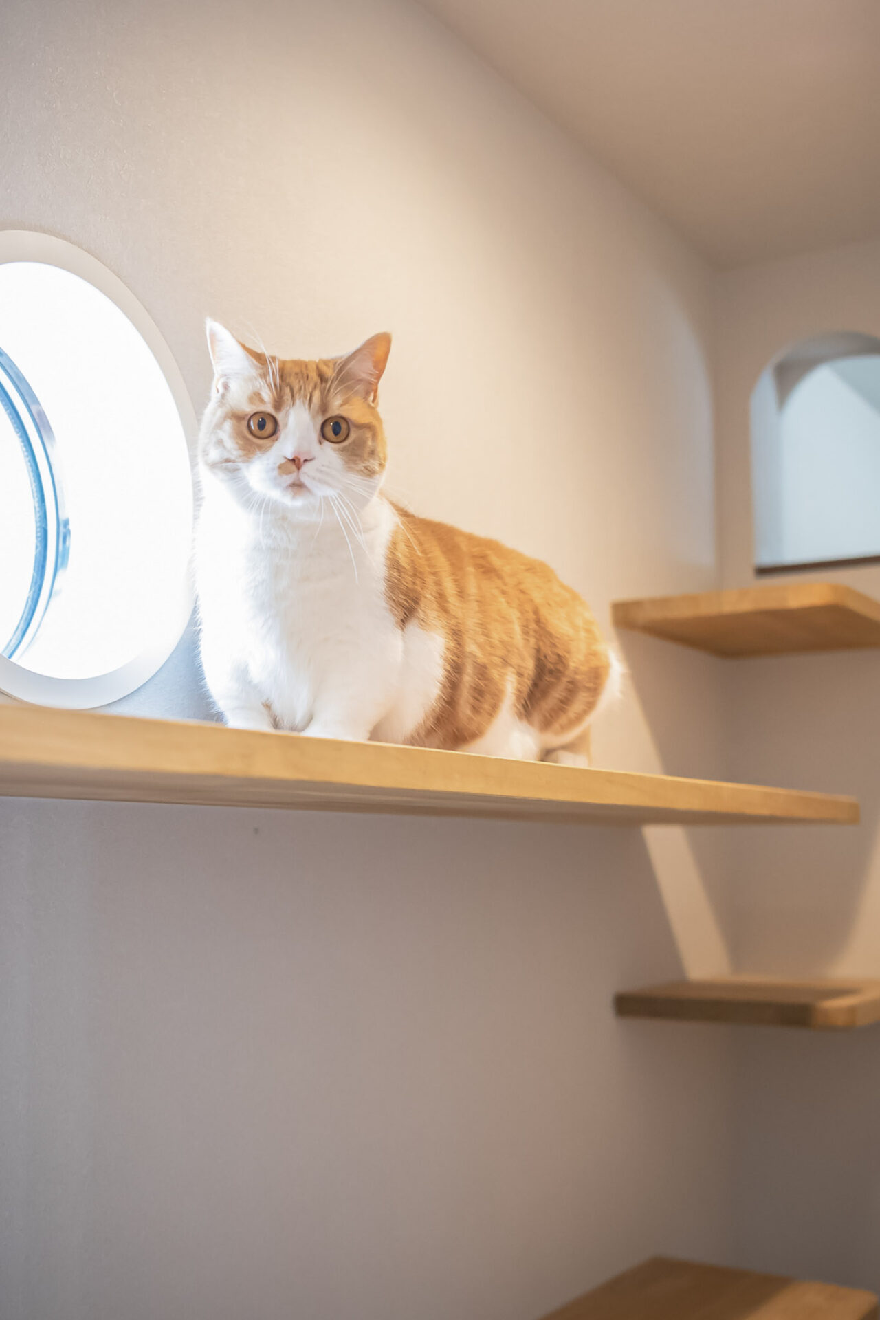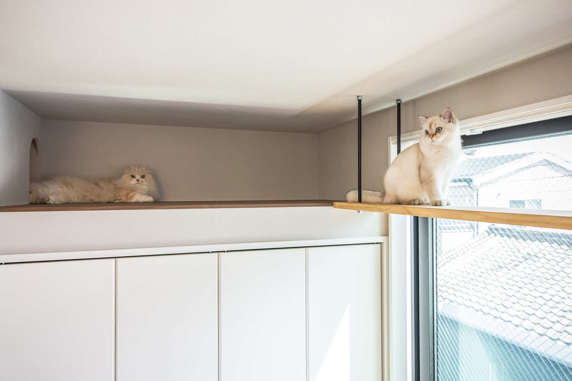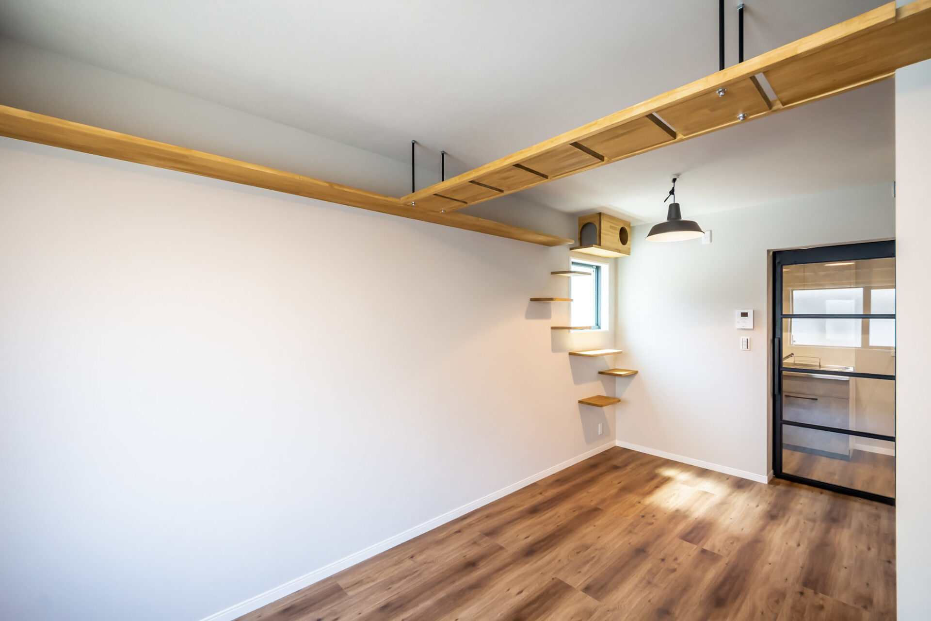 大きな窓もあり、窓の上部から猫ちゃんがその景色を見られるよう、窓にかかるようにキャットウォークを設置しました。