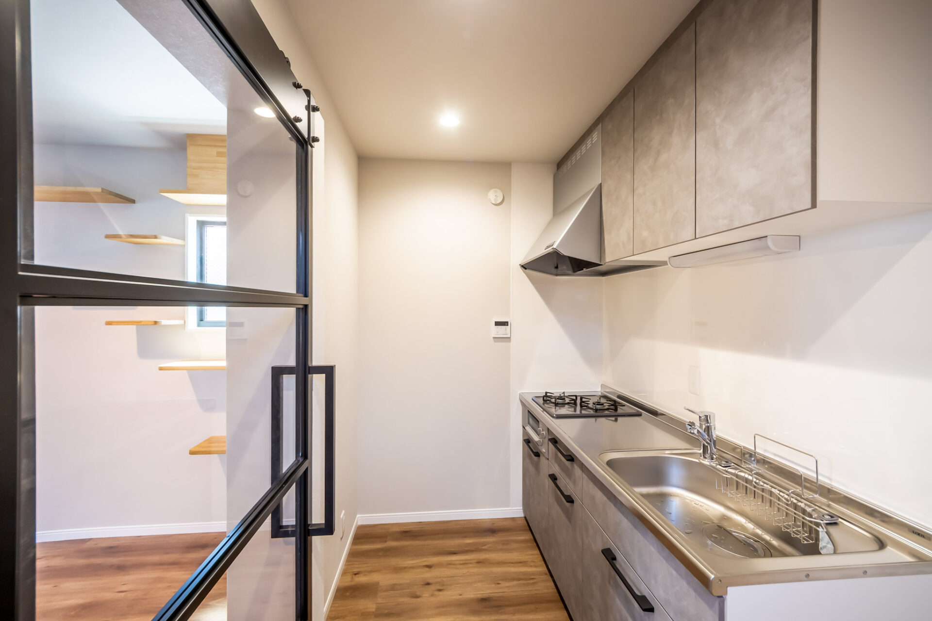 2階へ上がると、ガラス扉で仕切られたキッチンが現れます。