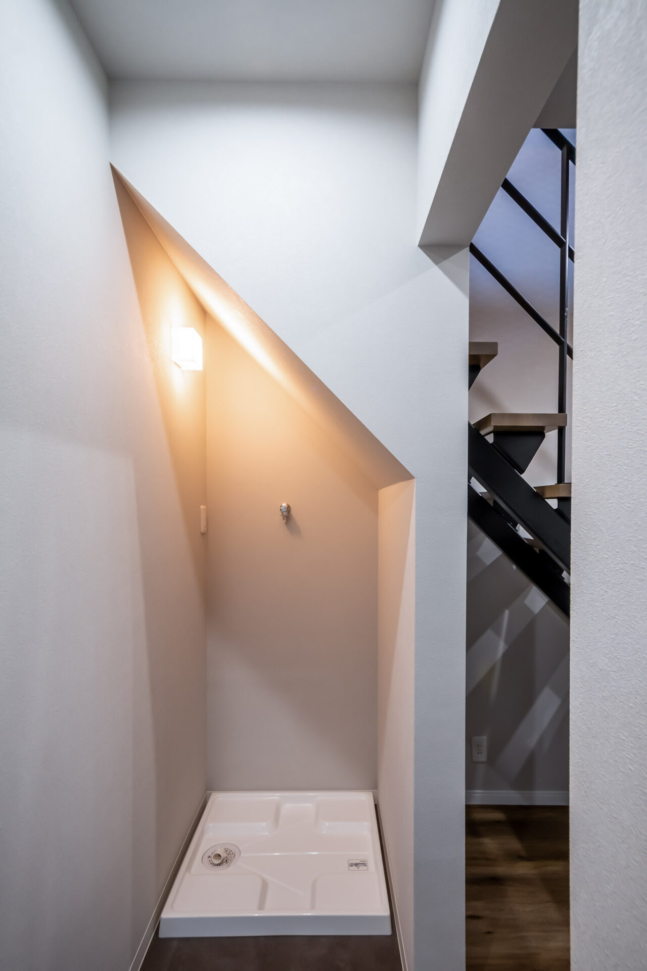 階段下のスペースを有効活用し洗濯機を置ける設計にしました。空間を無駄なく使うことで、限られた空間でもすっきりとした使い勝手の良い動線を実現しています。