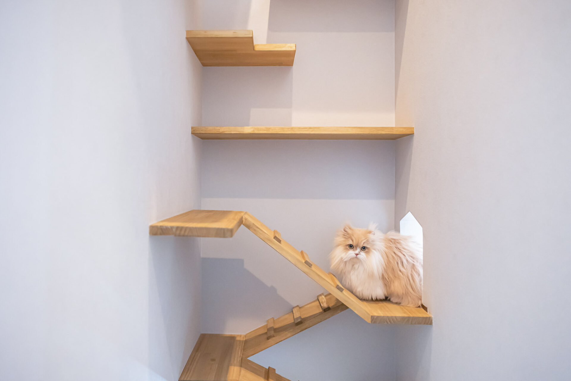 キャットウォークへ続くキャットステップは、ステップをずらしながら設置する省スペースタイプを採用。限られたスペースを工夫して人も猫ちゃんも過ごしやすく、人にとっても圧迫感のない快適な空間を実現しました。