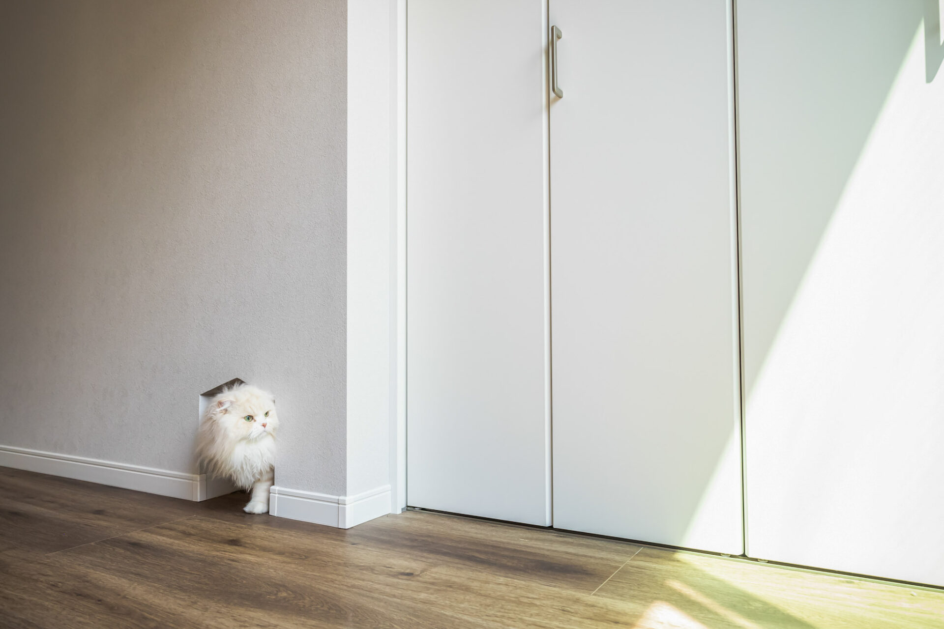 猫ちゃんが家中を自由に巡りながら、自分のお気に入りの場所を見つけていく。