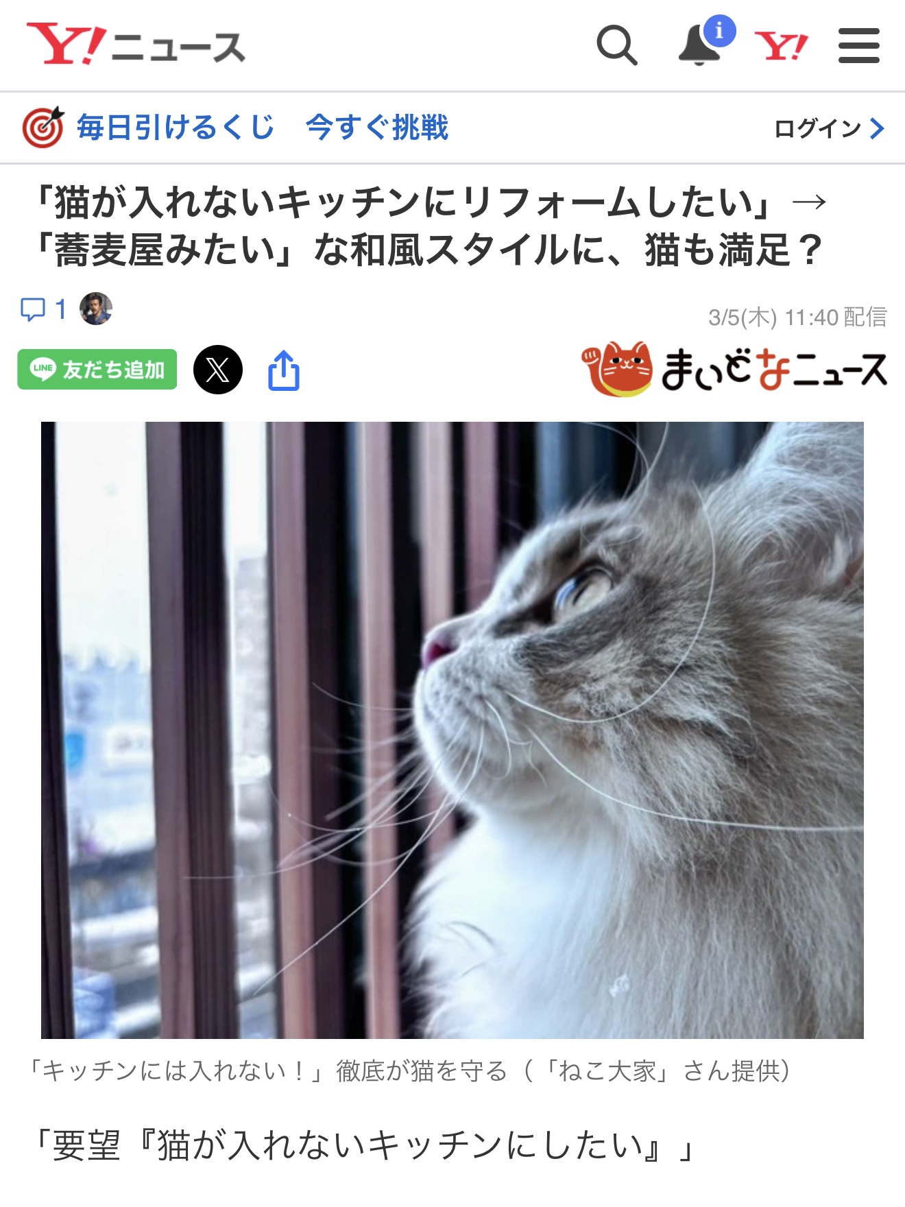 猫の安全を守る「独立キッチン」の工夫!まいどなニュースで紹介されました。