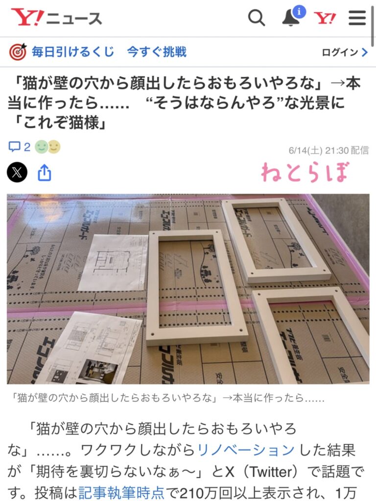 2025.06.14 ネットニュース 猫のアートウォールが「ねとらぼ」で紹介されました。 ねこ大家の手がけた猫の壁(キャットアートウォール)が、ねとらぼで紹介されました。こちらのキャットアートウォールは、猫が枠に収まると絵画のようになります。 ねとらぼの記事はこちら Yahoo!ニュース 前の記事 次の記事 一覧へ戻る