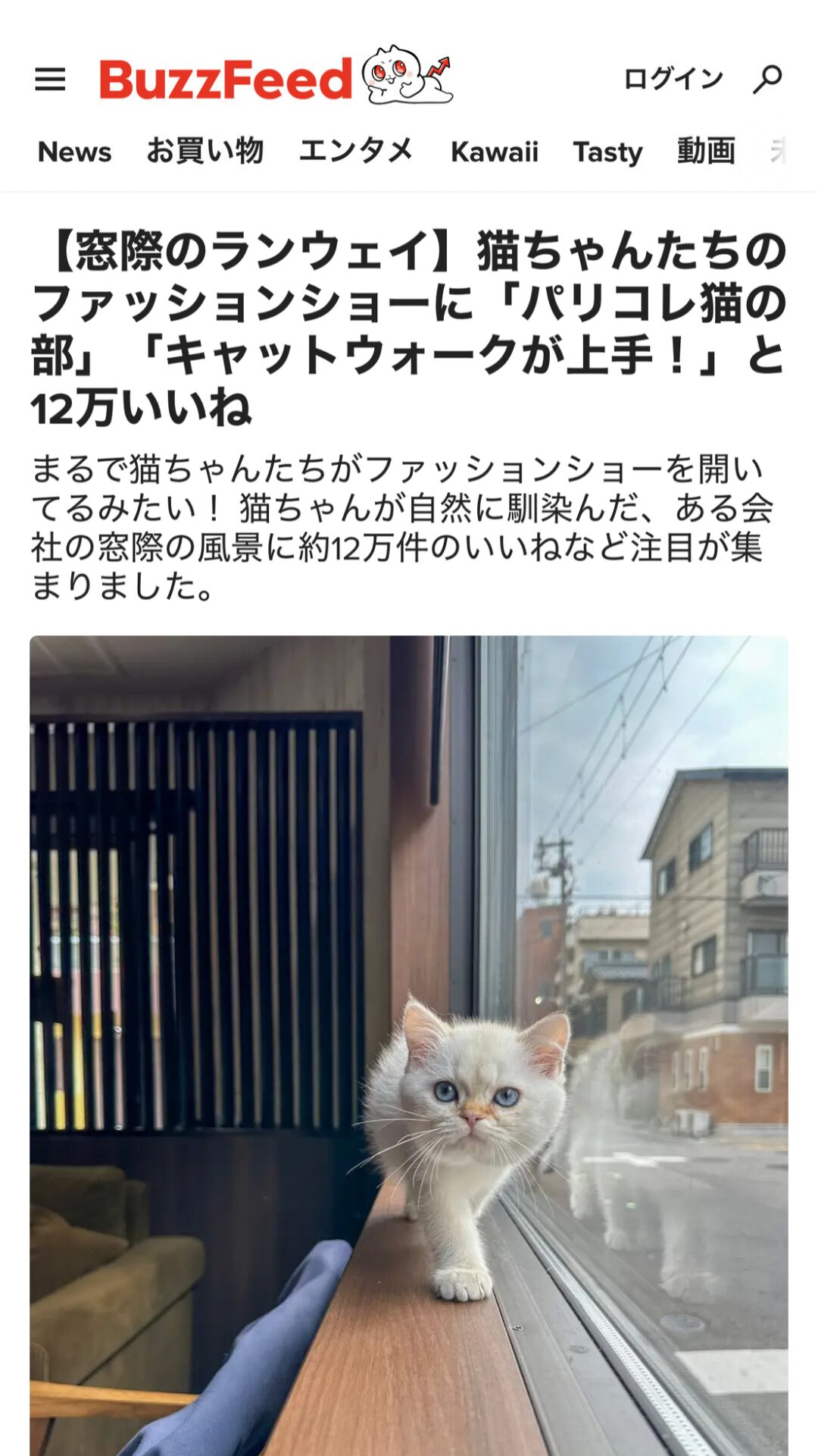 2025.06.07 ネットニュース 社員猫の窓際ランウェイが「BuzzFeed」で紹介されました。 Xで投稿した写真にたくさんの反響があり、BuzzFeed様にてご紹介いただきました。 記事はこちら 前の記事 次の記事 一覧へ戻る