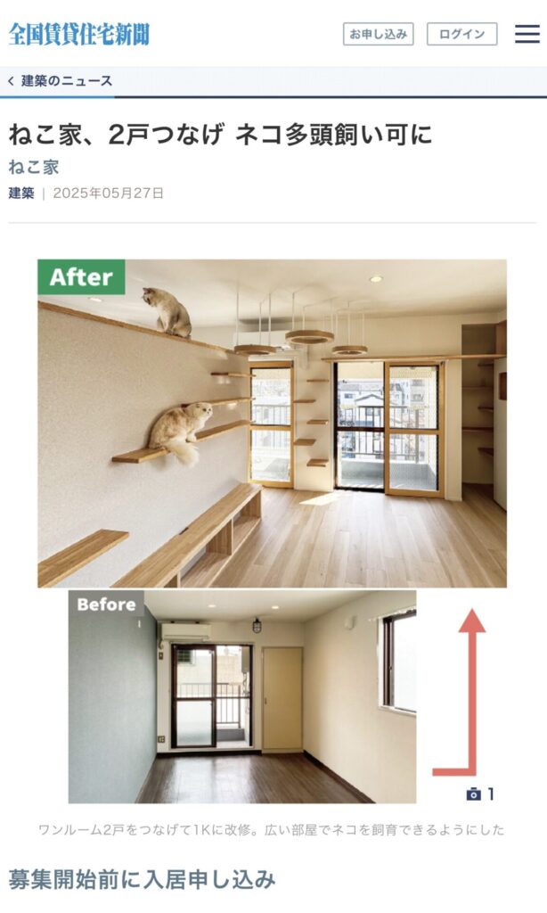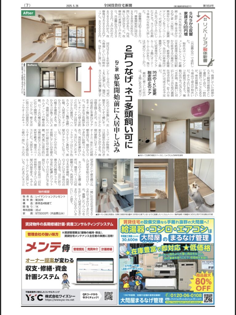 2025.05.27 雑誌/新聞 全国賃貸住宅新聞にリノベーション事例が掲載されました。 株式会社全国賃貸住宅新聞社が出版している「全国賃貸住宅新聞」2025年5月26日号に弊社のリノベーション事例が紹介されました。全国の家主さんが購読している業界紙になりますので、この記事をきっかけに猫と暮らせる物件が増えてほしいです。 前の記事 次の記事 一覧へ戻る
