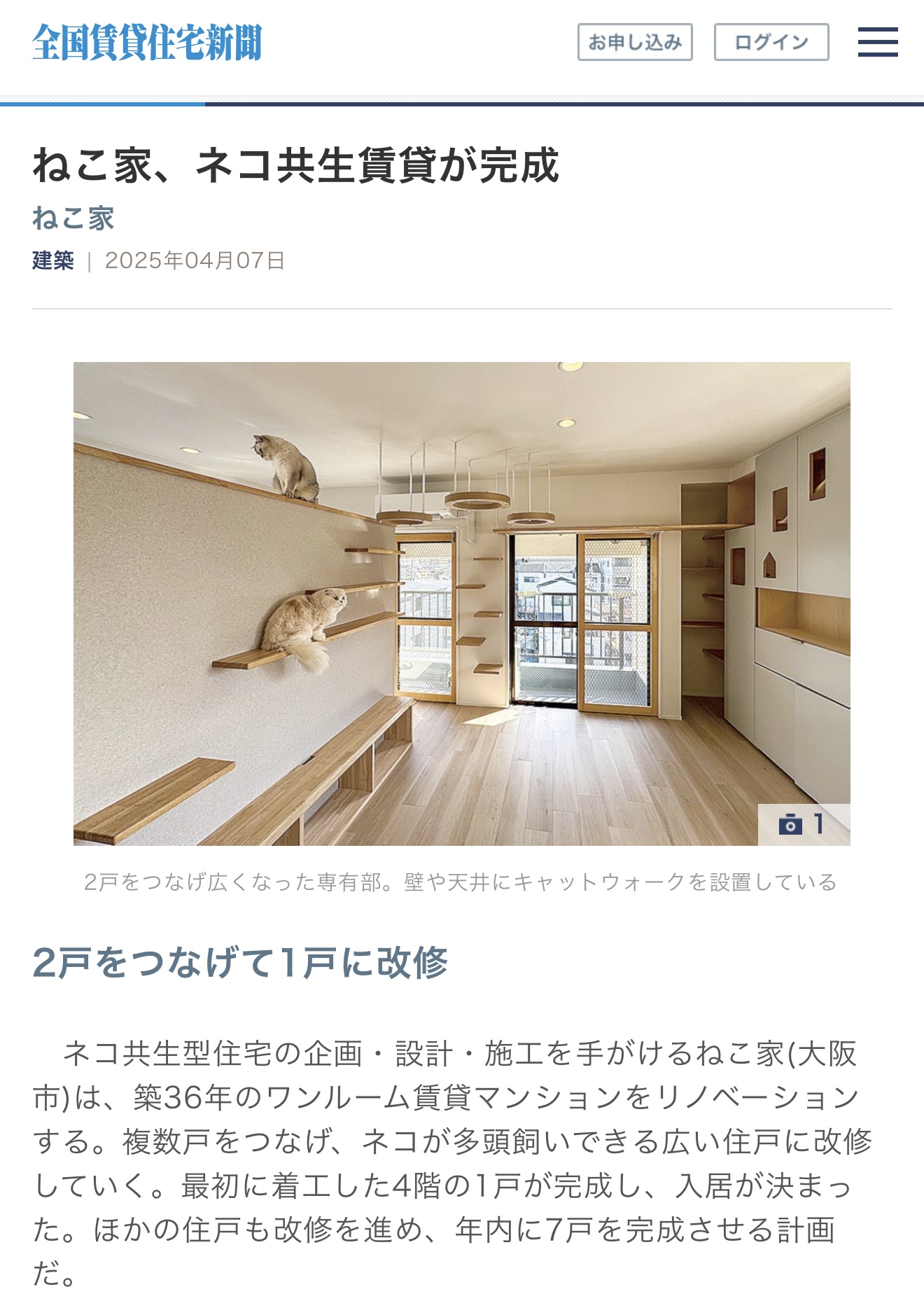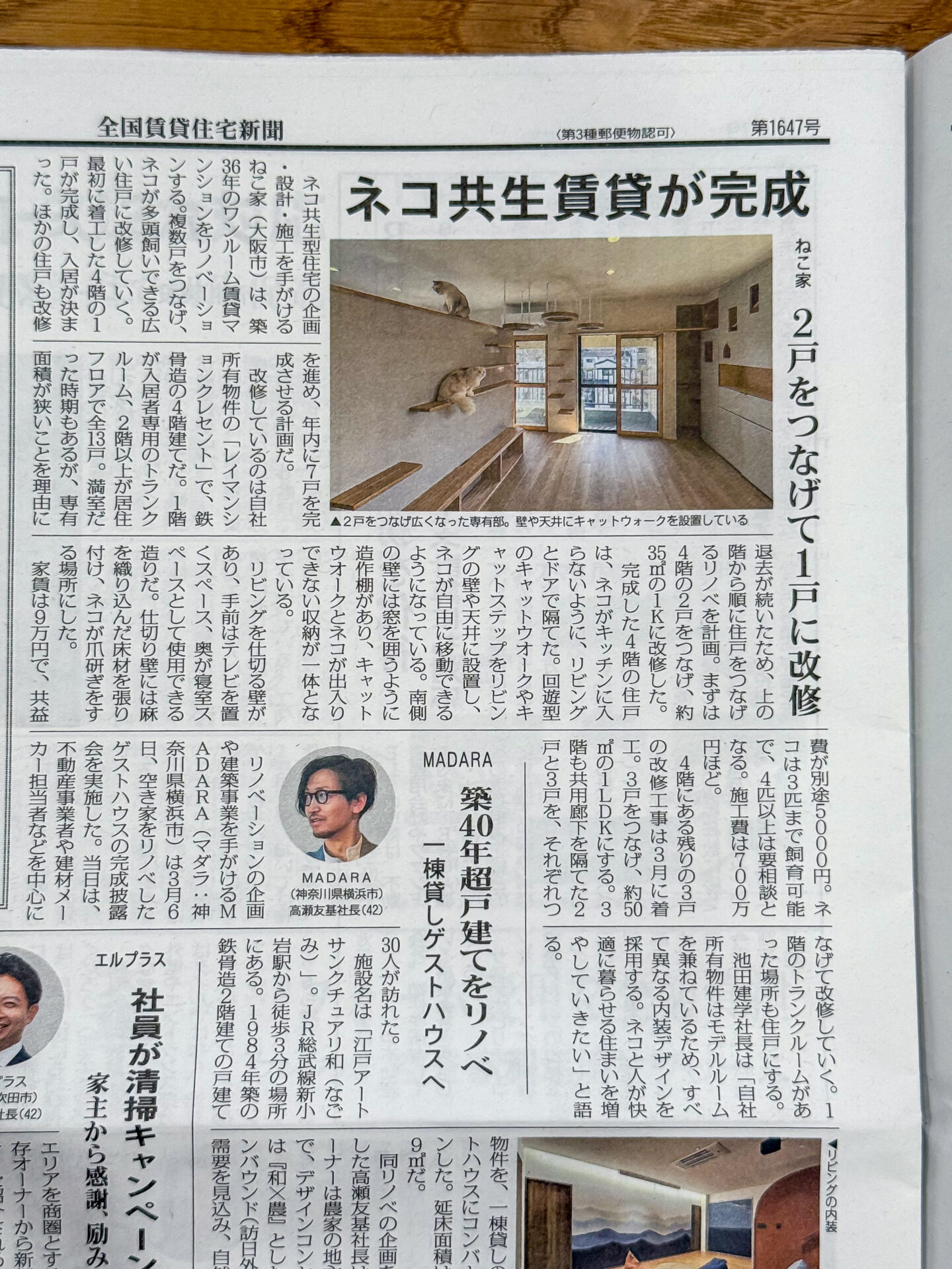 2025.04.08 雑誌/新聞 賃貸住宅の専門紙「全国賃貸住宅新聞」に掲載されました。 株式会社全国賃貸住宅新聞社が出版している「全国賃貸住宅新聞」2025年4月7日号に弊社の取り組みが紹介されました。多くの家主さんが購読している業界紙ですので、この記事をきっかけに猫可賃貸の魅力が広まり、お家で過ごせる猫たちが増えると嬉しいです。 前の記事 次の記事 一覧へ戻る