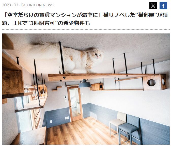 2023.03.04 ネットニュース ORICON NEWSで猫部屋が紹介されました。 ねこ大家の手がけた猫部屋がORICON NEWSで紹介されました。 「空室だらけの賃貸マンションが満室に」猫リノベした“猫部屋”が話題、1Kで“3匹飼育可”の希少物件も 次の記事 一覧へ戻る