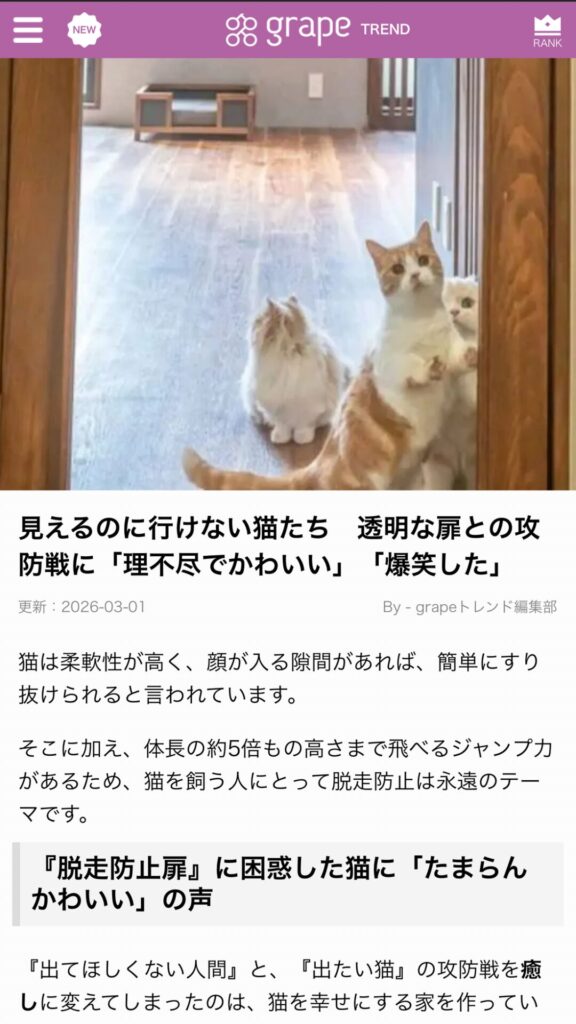 2026.03.02 ネットニュース 「見えているのに行けない…?」grapeで紹介された脱走防止扉 猫との暮らしに欠かせない「脱走防止対策」。grapeにて、弊社の透明な脱走防止扉が紹介されました。猫の習性を守りつつ、飼い主さんも猫の様子がひと目でわかる「透明な壁」という選択。安全対策を単なる義務ではなく、日常の癒しに変えてしまう「ねこ大家」ならではの遊び心溢れる工夫がまとめられています。 記事はこちら 前の記事 次の記事 一覧へ戻る