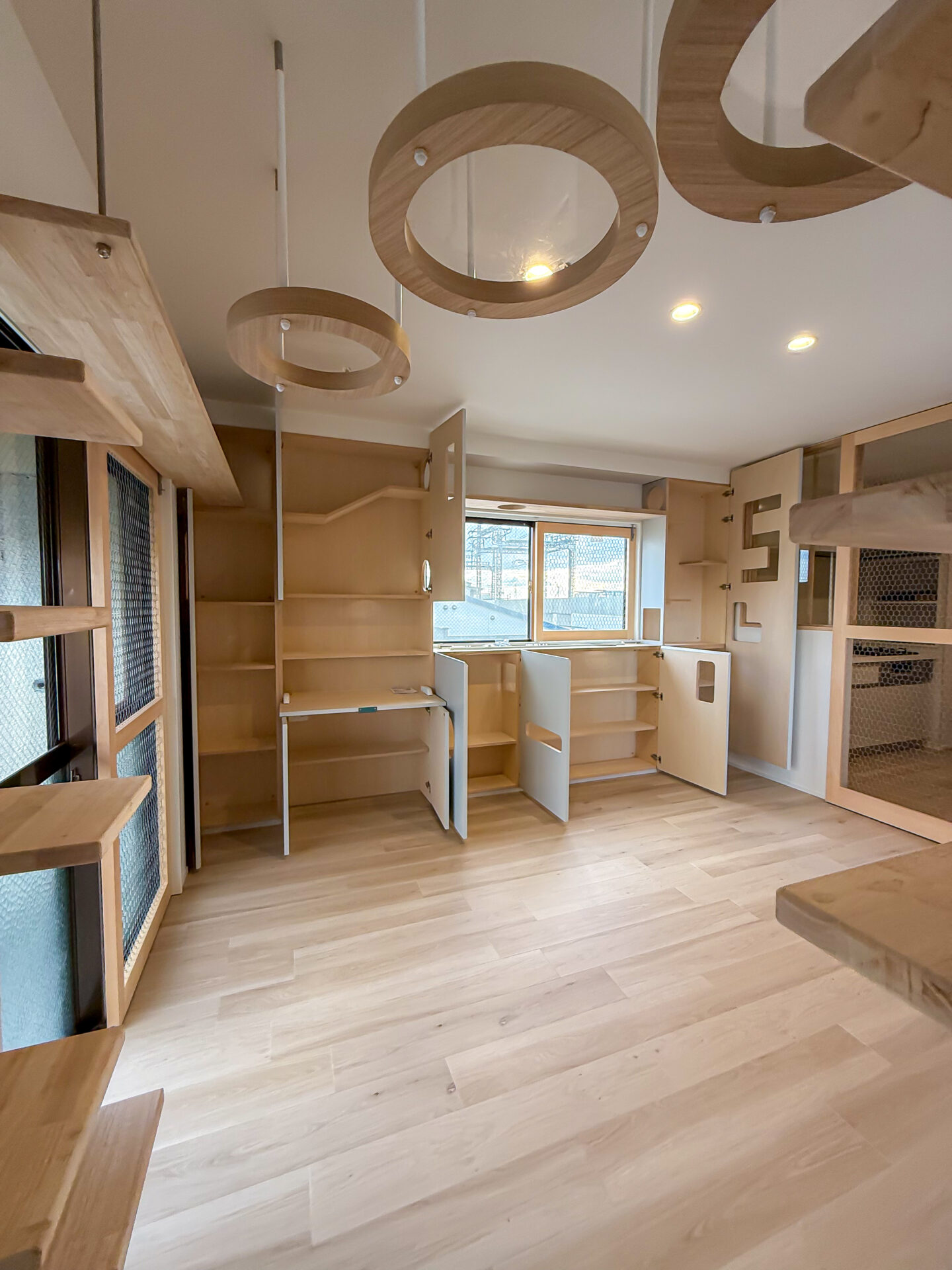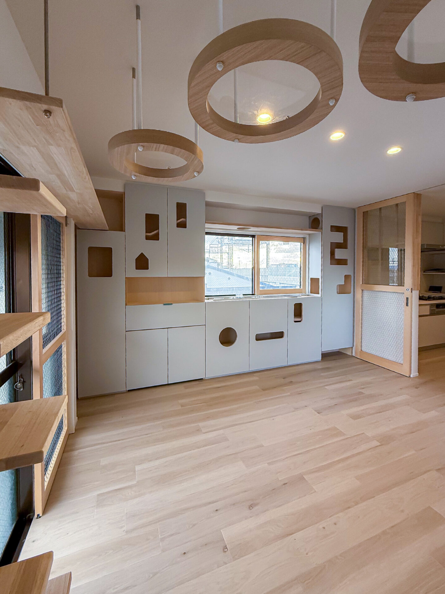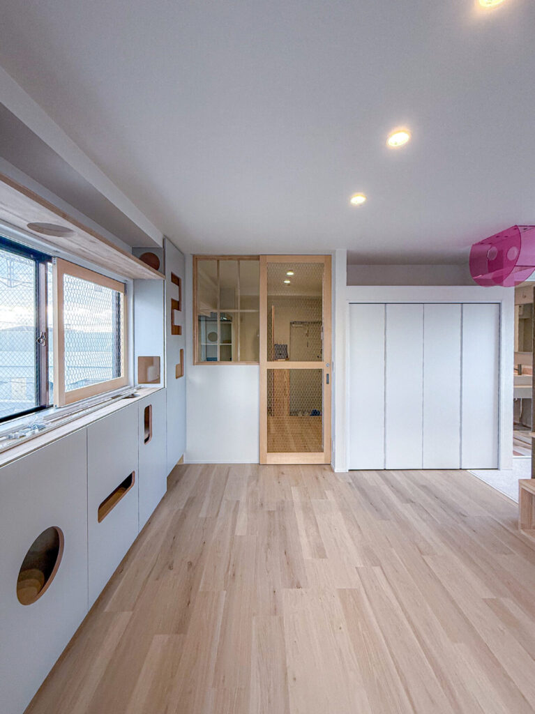 ねこ設備は、独立キッチン、脱走防止柵、キャットウォーク、キャットステップ、独立壁、猫トイレスペース、猫の天袋、猫トンネル、猫専用窓、壁面収納を活かした猫の迷路などを完備しています。