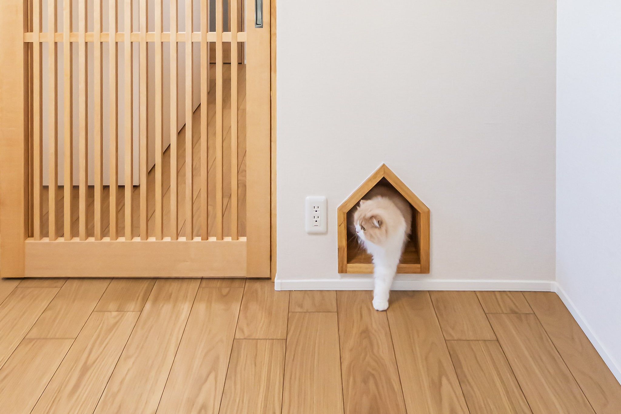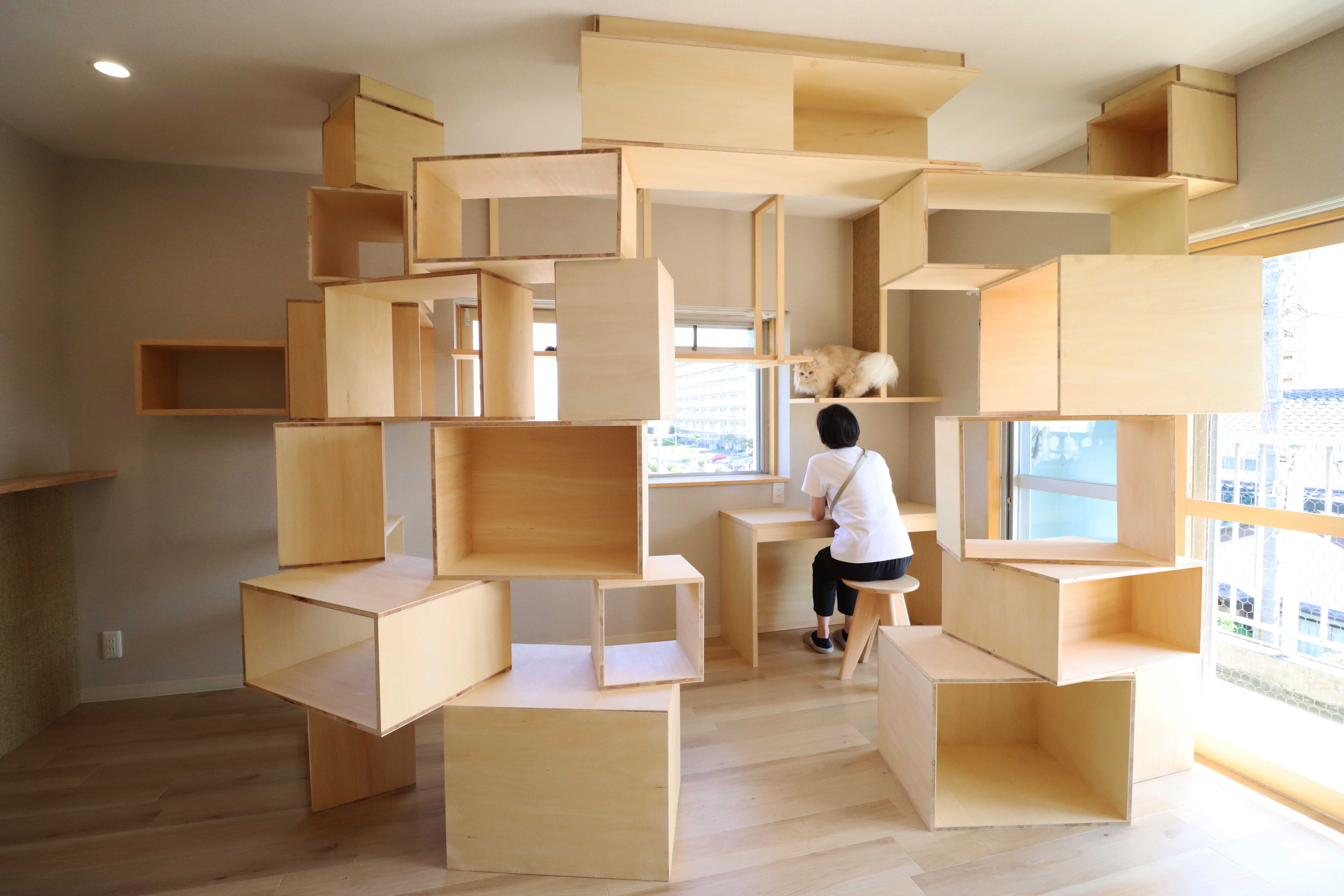 猫は横方向よりも縦方向の広さを重視する生き物。上下階を移動できるキャットウォークやキャットタワーの設置は、運動不足の解消にも役立ちます。・給水所やフードステーションの配置